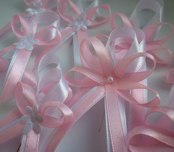 Jemné ružové košíky pre družičky s bielou stuhou. V ponuke aj iné farebné kombinácie.