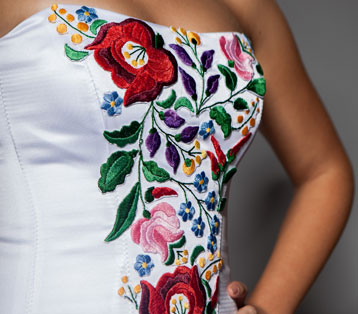 Lodičkový výstrih z čipky a ramienka sú bohato zdobené perličkami, kamienkami a flitrami.