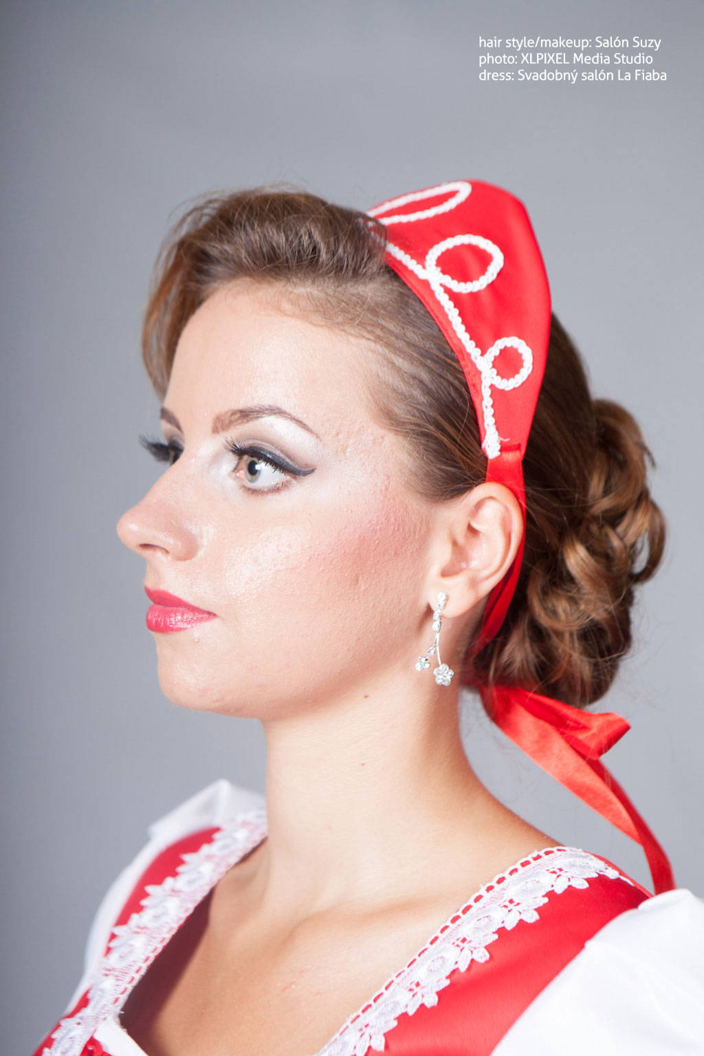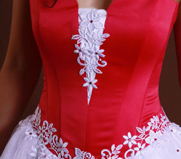 Jemný srdiečkový výstrih, červená sukňa s čiernymi ružami a trblietavá brošňa.